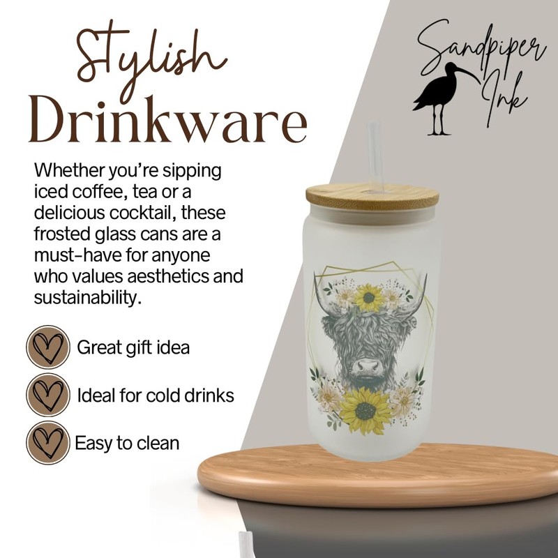 16oz Frosted Glass With Bamboo Lid and Plastic Straw - Western (Highland Cow #2, 16oz)