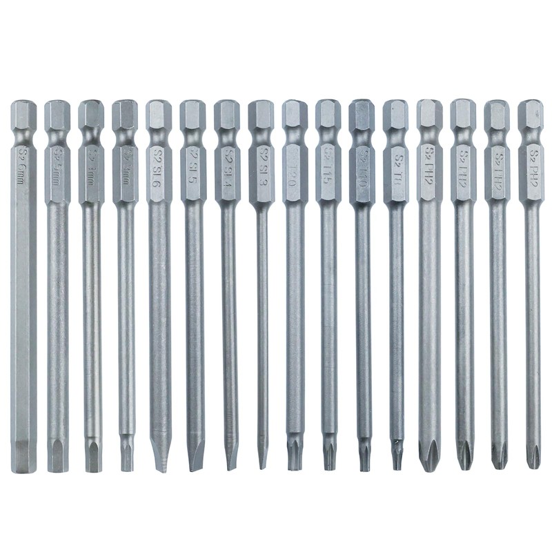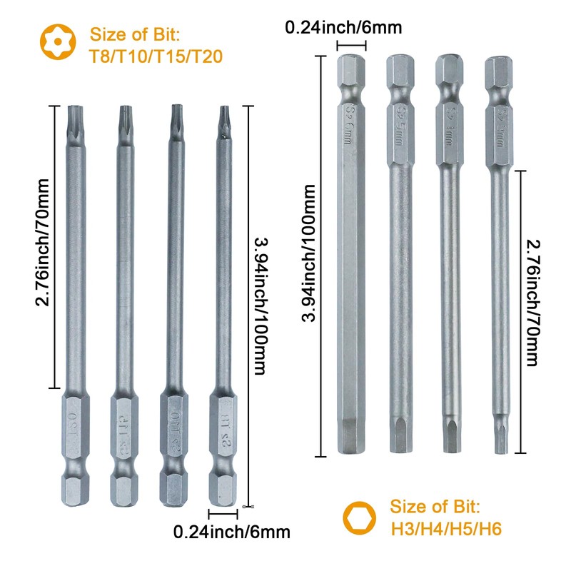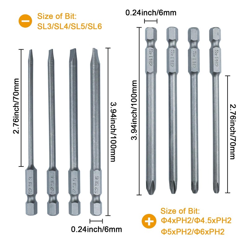• SCREWDRIVER SIZE: 100mm long screwdrive set. Hex head: H3, H4, H5, H6; Torx head: T8, T10, T15, T20; Flat head: SL3, SL4, SL5, SL6; Cross head: Φ4xPH2, Φ4.5xPH2, Φ5xPH2, Φ6xPH2