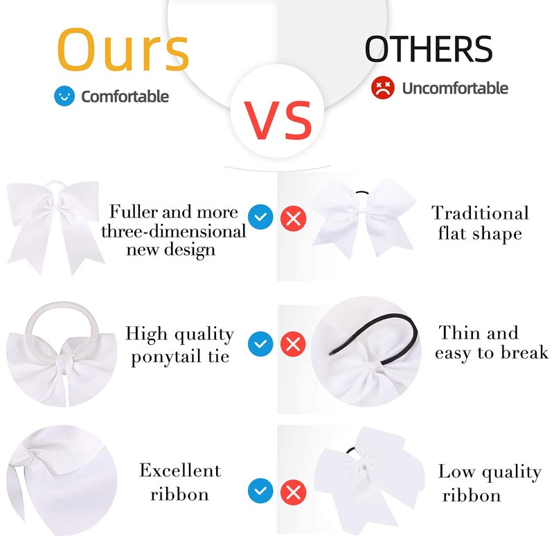 - Tested by CPSIA - The jumbo 8 inch solid color cheer hair bows are made by 3 inches width grosgrain ribbon with a Ponytail Holder in back, a good hair accessories for girls child kids ponytail. All materials are environmentally friendly and non-polluting.