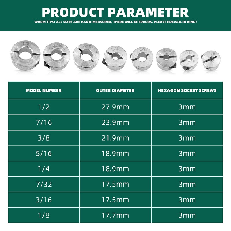 - Split Ring Stop Collar Imperial Sizes: 1/8", 3/16", 7/32", 1/4", 5/16", 3/8", 7/16", 1/2”