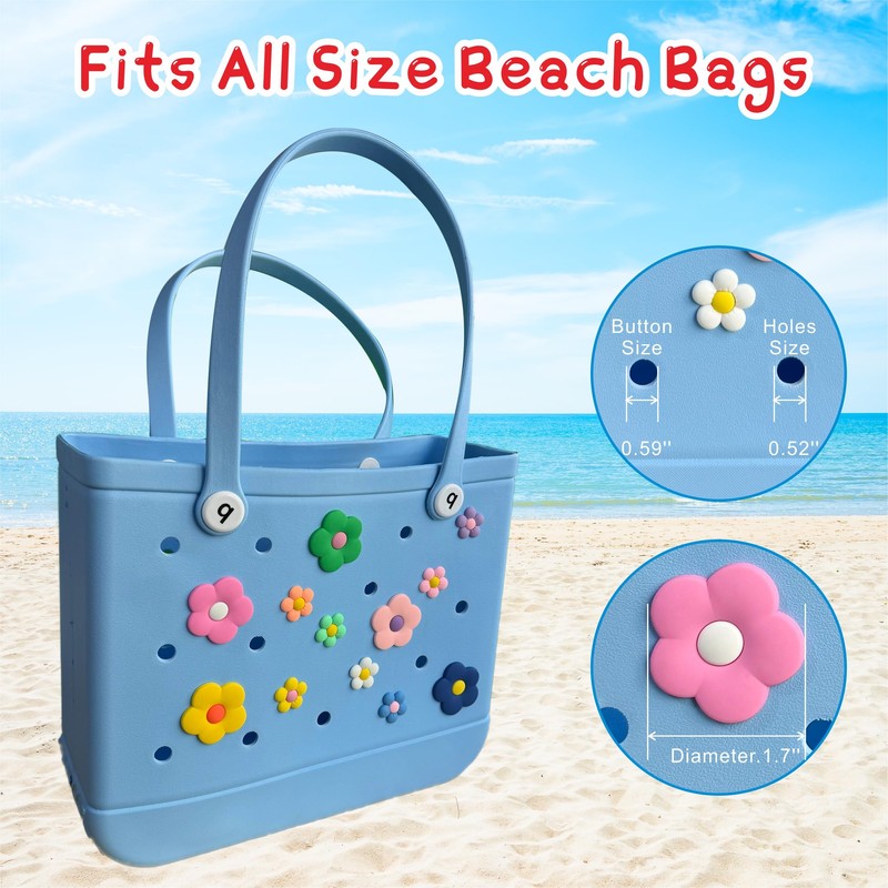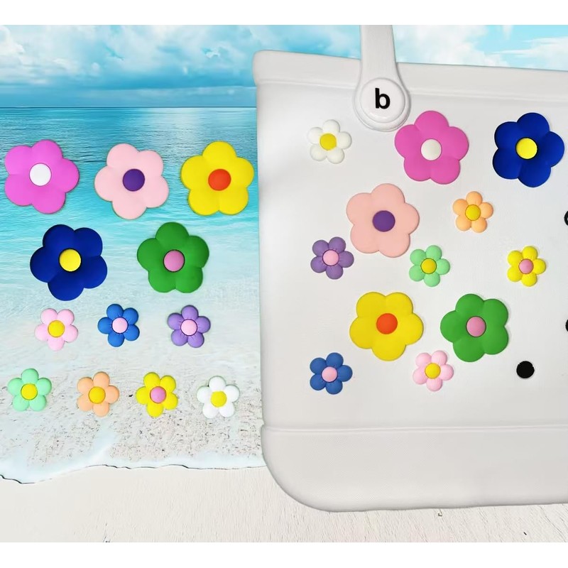 • Brighten Up Your Beach Tote: Add a cheerful burst of color to your Bogg Bag or any other rubber beach tote with this 16-pack of vibrant flower charms. Perfect for showcasing your unique style and embracing a playful, beachy vibe