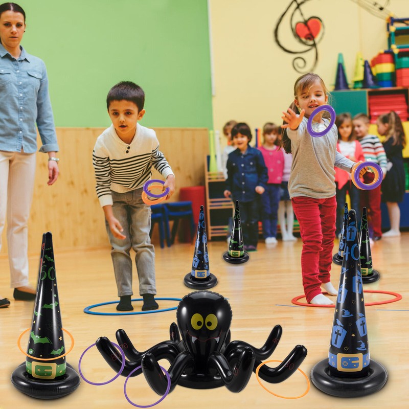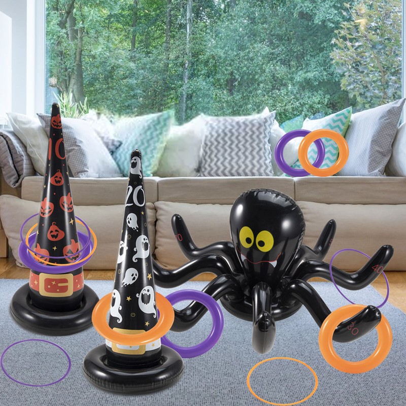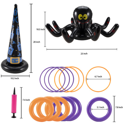 Our Fun Halloween Inflatable Octopus and Witch’s Hat Ring Toss Game includes 12 Rings ( 6 Inflatable + 6 Plastic Rings ) 1 Octopus, 2 Witch’s Hat and 1 Pump.