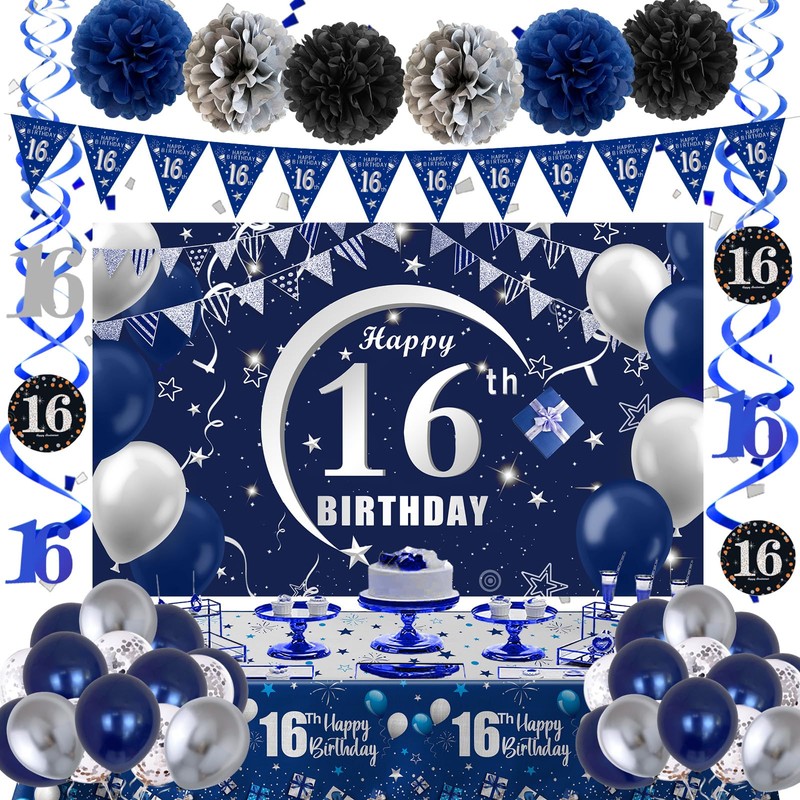 - Value Package 16th Birthday Decorations for Boys Girls: 16th blue silver birthday party decorations kit includes, 1pc blue 16th happy birthday backdrop banner, 1 set 16th happy birthday flag bunting, 6pcs blue hanging swirls and 6pcs 16 birthday pendants, 15pcs blue latex balloons, 6pcs silver latex balloons, 10pcs silver confetti balloons, 1pc 16th happy birthday tablecloth, 6pcs paper pompoms, 1pc ribbon, 1pc dot glue.