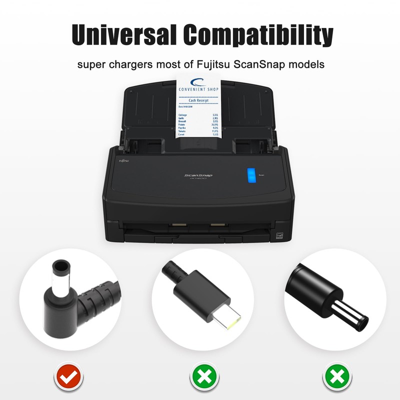 Power Adapter Specification: Input:World Wide Input Voltage 100-240VAC 50/60Hz Output:16V 2.6A 41.6W OVP, OCP, SCP Protection (OVP: Over Voltage output Protection. OCP: Over Current output Protection. SCP: Short Circuit output Protection) Replace Part Numbers: P/N: PA03656-B005 PA03656-B005-R PA03656-B015 P/N: PA03656-B005 PA03656-B015 PA03656-B205 Compatibility: Fujitsu WiFi ScanSnap iX500 iX-500 ( PA03656-B005 ) p/n: PA03656-B005 PA03656-B005-R PA03656-B015 Fujitsu ScanSnap iX500 Scanner PA03656-B005 S500, S510, fi-5110C PA03656-K949, SEB55N2-16.0 Fujitsu ScanSnap iX500, iX500 Deluxe, iX500 Deluxe Bundle Scan Snap Scanner P/N: PA03656-B005 PA03656-B015 PA03656-B205 Fujitsu PFU ScanSnap iX1400 FI-iX1400 PA03820-B235 Fujitsu iX1600 FI-iX1600 PA03770-B635 ID Document Scanner DA-40A16 PA03010-6661 Fujitsu ScanSnap iX1500 Document Scanner Deluxe iX-1500 CG01000-299401 PA03770-B215 CG01000299401 PA03770B215 Fujitsu ScanSnap SV600 Scanner PA03656-K949 PA03010-6461,PA03641-B005 Package content 1 x AC Charger Adapter Power Supply for Fujitsu ScanSnap iX500 1 x US Cable 1 x User Manual