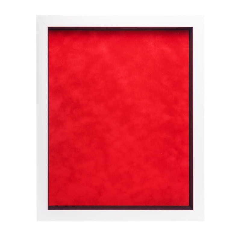White wood shadow box frame with interior dimensions of 16x20 inches with 1 3/4 inches of usable depth. UV-resistant, frame-grade acrylic protective front. Features our 4-ply acid-free backing in red suede. Usable depth is 1 3/4 inches. Overall frame size is 18x22 inches. Includes shatter-resistant acrylic front, acid-free backing and wall hanging hardware. Hanging hardware is included but not installed—easily attach for vertical or horizontal display! Proudly made in the USA!