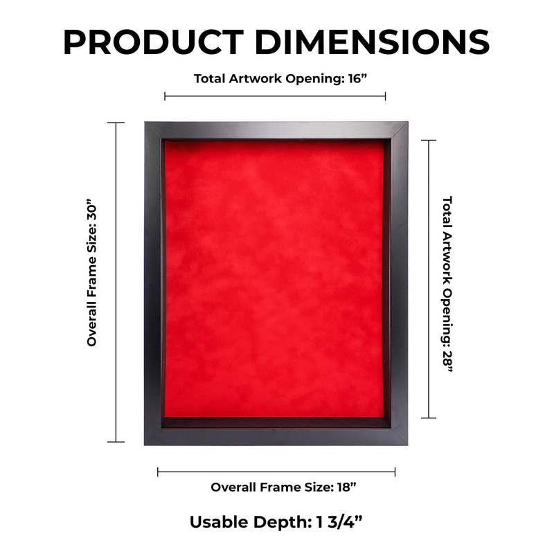 16x28 Shadow Box Frame Black Wood with a 1 3/4" Usable Display Depth Includes a Red Suede Acid-Free Backing Board, UV Resistant Acrylic, and Hanging Hardware