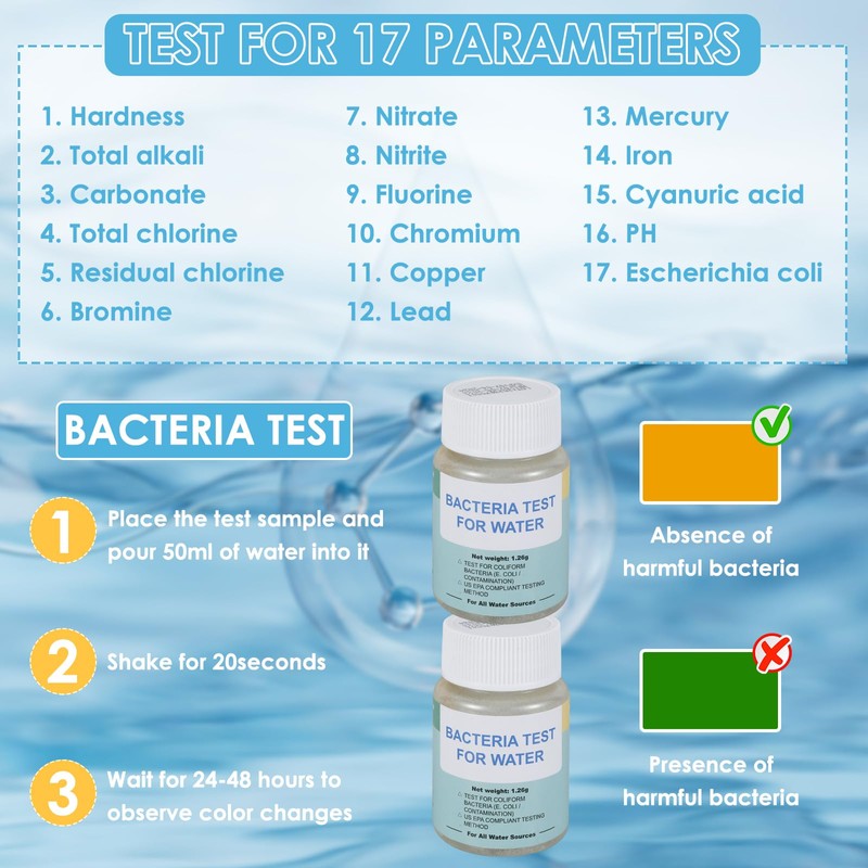 - 💦【Accuracy and with E. coli Powder】This water testing kit is easy to use. 3 steps can get an accurate testing result. Also, the package contains 2 bottles of E. coli test powder for testing. The E. coli powder is easy to test. Just put in the test sample, pour 50ml of water, wait for 24-48h to observe the color change.