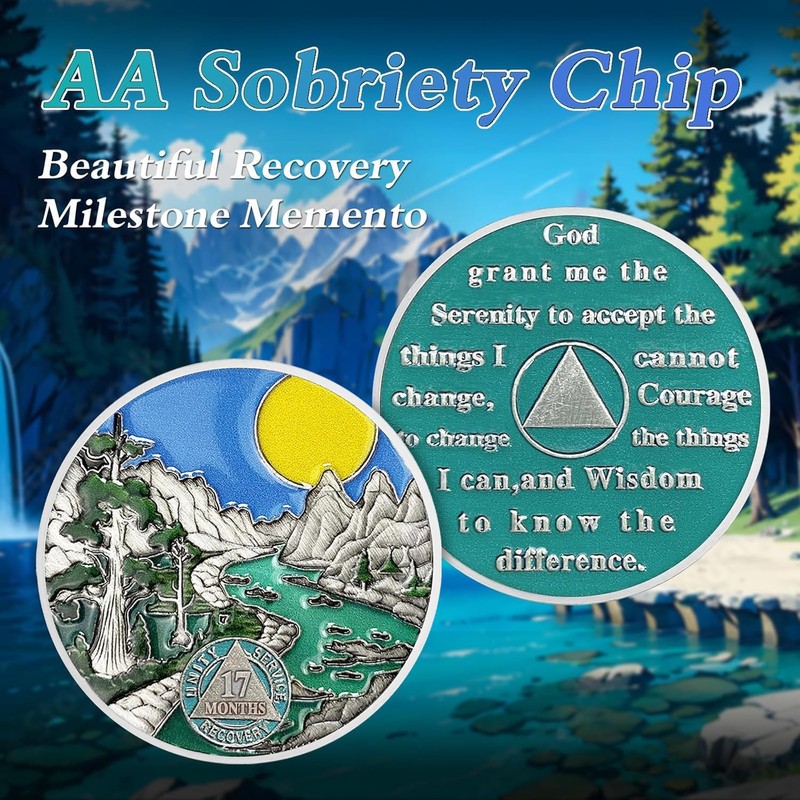 - Why You Should Buy This 17 Month Sobriety Coin Gifts Set is more than just a keepsake; it's a powerful symbol of your ongoing journey in Alcoholics Anonymous. The forest, river, and tree design, combined with the Serenity Prayer, embodies the strength, unity, and perseverance of the recovery community. Whether purchased for yourself or as a gifts for someone special, this coin serves as a daily reminder of hope, resilience, and the continuous pursuit of sobriety.