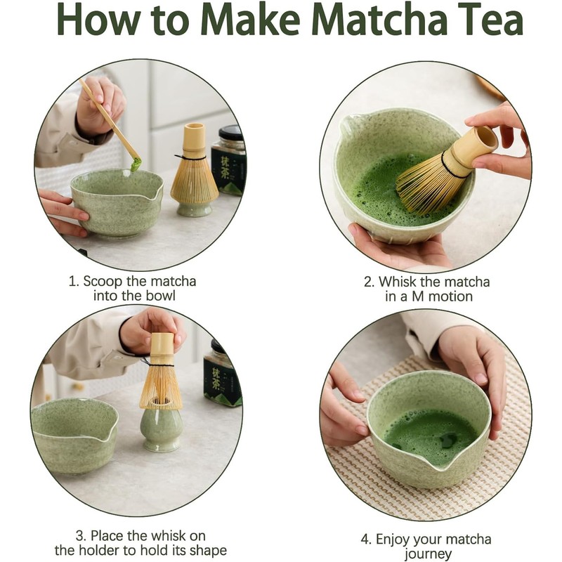 - [Exclusive Matcha Ceremony Collection]: Our 4-piece set includes essential tools for an authentic matcha experience: 1* Bamboo Whisk, 1* Bamboo Scoop, 1* Ceramic Bowl 500 ml/17 oz, and 1* Ceramic Whisk Holder. Crafted with precision, this ceramic matcha set is designed to make embracing matcha as a lifestyle effortlessly stylish. Elevate your tea ritual with our thoughtfully curated collection, perfect for both enthusiasts and newcomers to the world of matcha.