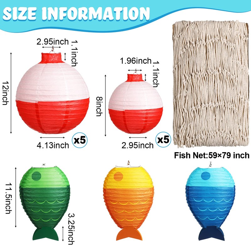 17 Pcs Fishing Birthday Party Decorations Set 3 Fish Shaped Hanging Paper Lanterns 10 Fishing Bobber Round Paper Lanterns 1 Fish Net and 3 LED Lights for Fishermen Themed Pool Party Decorations