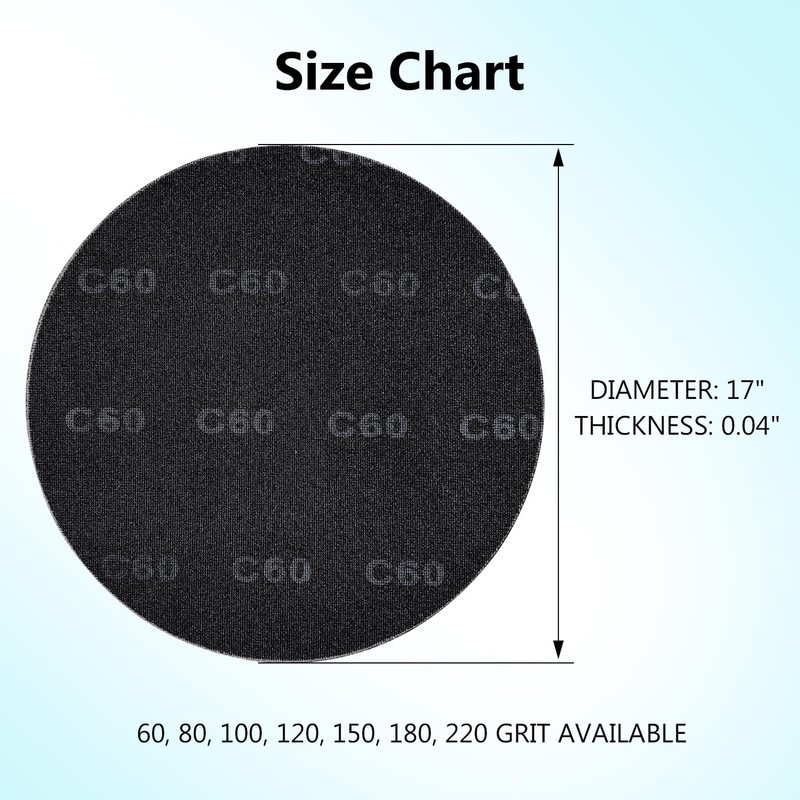 - Specs: 17” diameter, 60, 80, 100, 120, 150, 180, 220 grit available. Sold in packs of 10. Waterproof resin, wet or dry use, washable and reusable