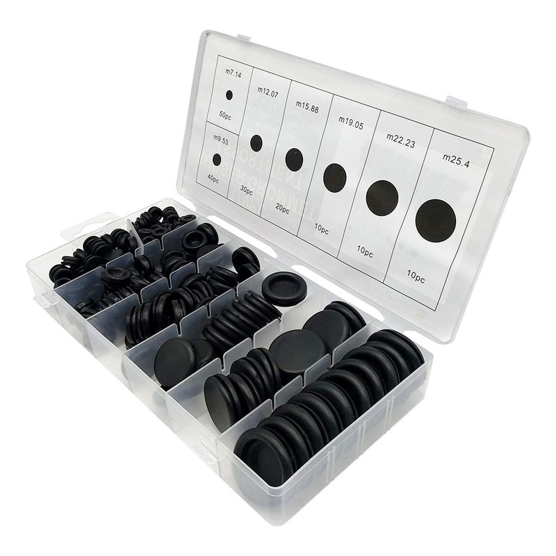 - Package Includes: 170pcs rubber grommets in 7 commonly used sizes , including 50pcs in 7.14mm/0.28inch; 40pcs in 9.53mm/0.375inch; 30pcs in 12.07mm/0.475inch; 20pcs in 15.88mm/0.625inch;10pcs in 19.05mm/0.75inch; 10pcs in 22.23mm/0.875inch; 10pcs in 25.4mm/1inch.