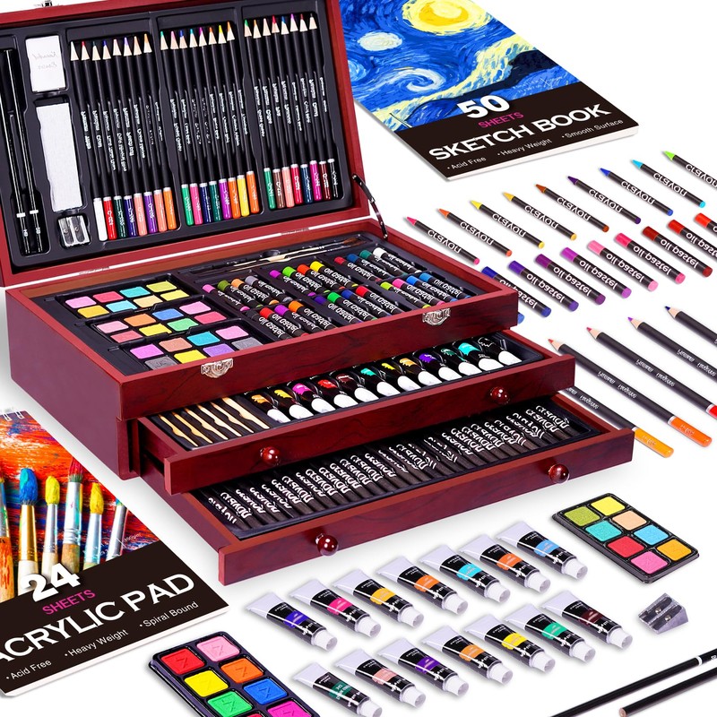 - 【175 PCS ART SUPPLIES】The 175 piece deluxe wooden art set includes 60 crayons, 24 colored pencils, 24 oil pastels, 24 watercolor cakes, 24 acrylic paints, 8 paint brushes, 2 sketch pencils, 5 sandpaper blocks, 1 eraser, 1 sharpener, 1 x 50 sheets A4 sketch pad, 1 x 24 sheets A4 actylic pad, all in 1 Wooden Case.