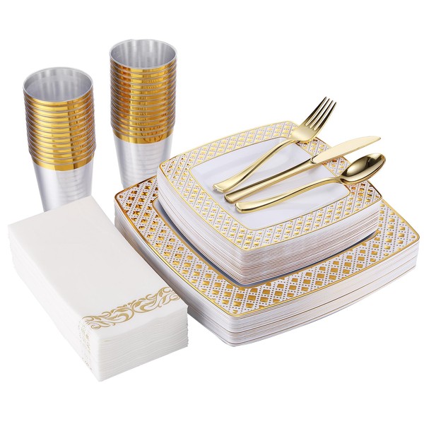 - Gold Dinnerware Set is safe for you and your guests! Disposable square dinnerware set is made of 100% food-grade plastic, BPA free. The Heavy Duty square dinner plates and square salad plates offer reliable strength and durability, ensure won't scratch or break easily.