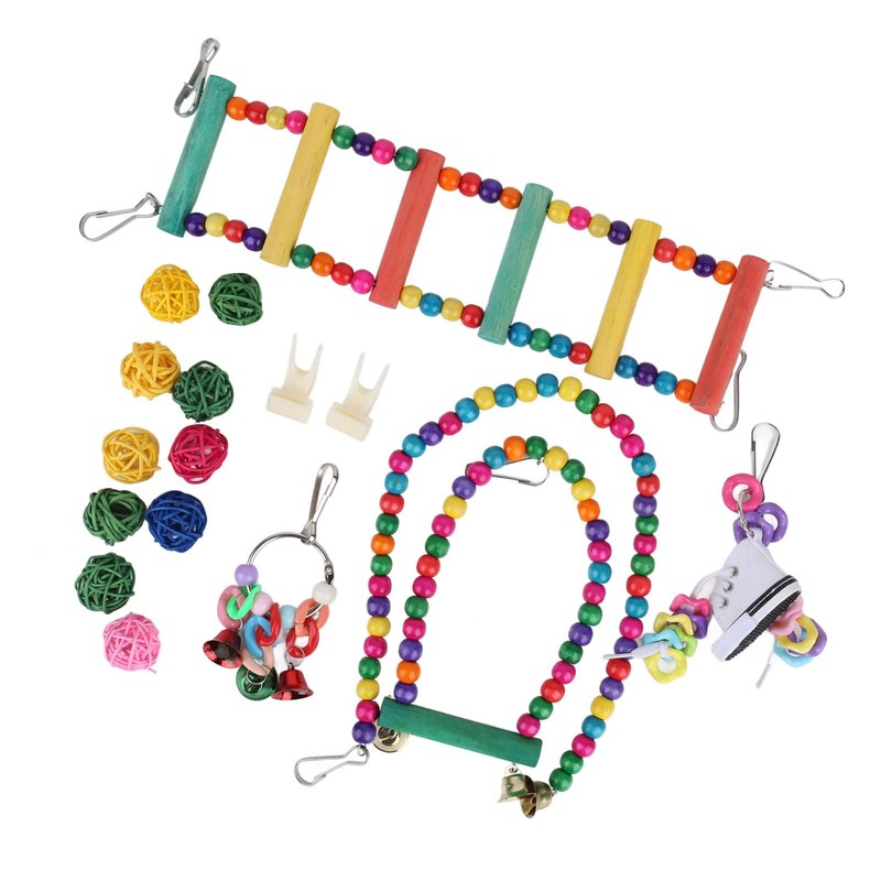 - PRODUCTS INCLUDE: Bird toy set contains standing perch, hanging ladder, rattan balls and many other types of toys for all types of birds to play with.