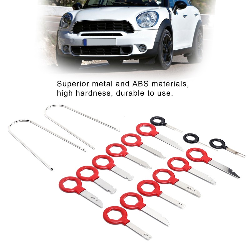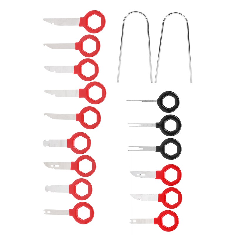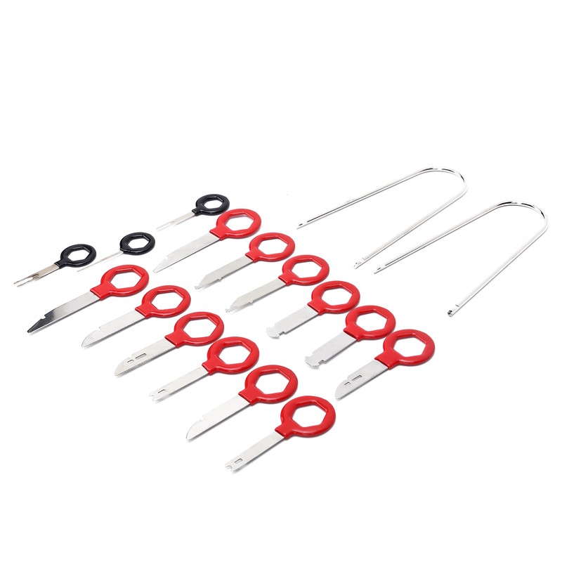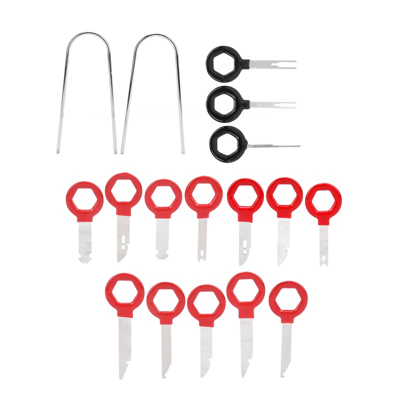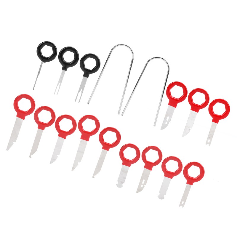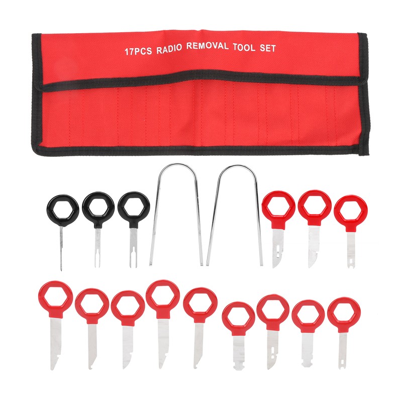 1、Professional removal tools for car radio and audio, total of 17pcs, meet different needs. 2、Ergonomic design, easy to hold, making the disassembly work more convenient. 3、Premium metal and ABS materials, rugged and durable, not easy to deform and damage. 4、Comes with a storage bag, which can keep all the tools organized and easy to carry. 5、Manufactured to meet standard specification, strictly follow factory quality control.