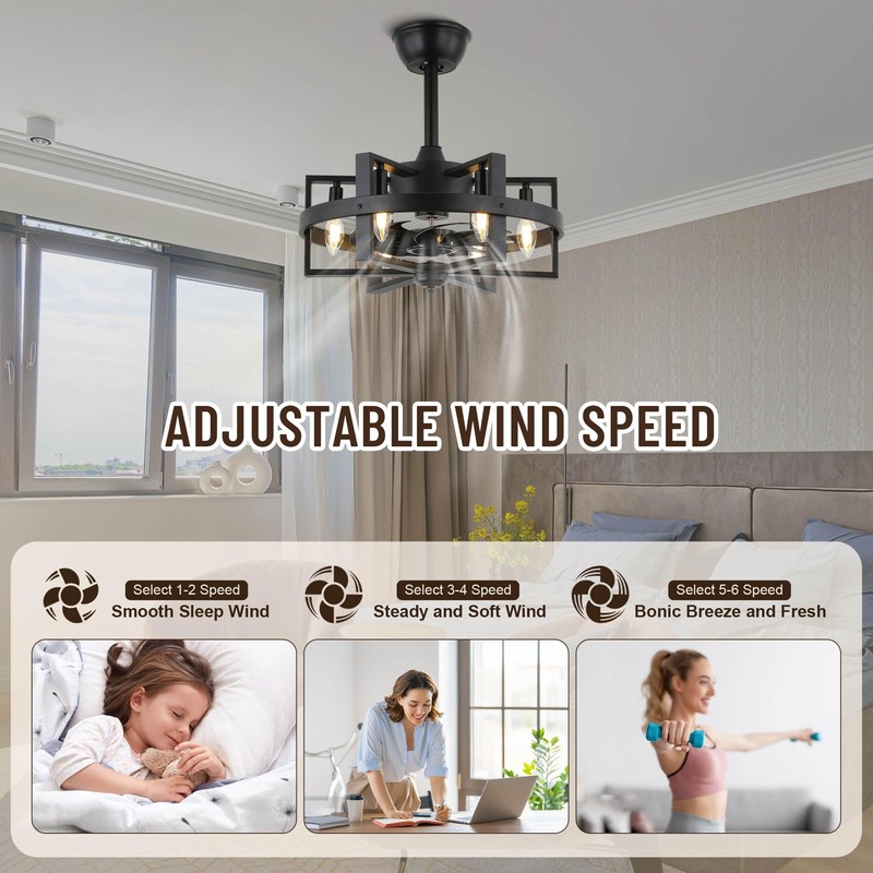 - 【Black Caged Fan with Light】- 6* E12 blubs light bases (Bulbs not included),metal double cage ceiling fan light with 8 ABS black blade ,perfectly decorate farmhouse, industrial, vintage, rustic and modern style homes.