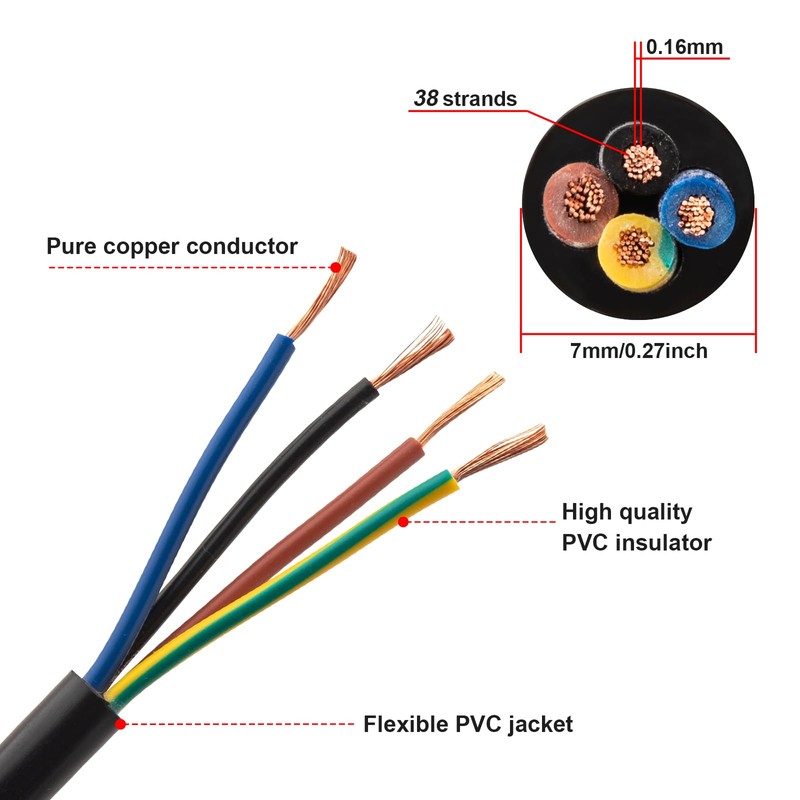 - SPECIFICATION: RVV 4x0.75mm²electrical wire consisting of 38 strands of 0.16 mm oxygen-free copper, Outer diameter: 7,0mm, Inner diameter: 2,1mm, Rated temperature: 70℃, Rated voltage:300/500V; Color: Blue, Brown, Black, Yellow Note Green, Jacket material: PVC black
