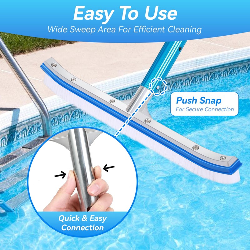 • Effortless Cleaning: Say goodbye to tedious hand scrubbing. The curved brush head can reach corners and gaps, and the brush bristles are strong enough to remove dirt without damaging the pool surface. Pool brush will leave your pool looking fresh and restore its crystal-clear clarity.