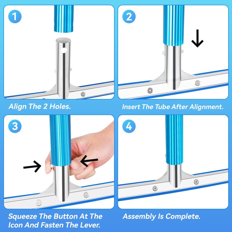 • Telescopic Handle: The adjustable pole length allows you to easily clean hard-to-reach areas. The ergonomic handle design offers a comfortable grip, reducing hand fatigue during use. With the long brush handle, you can reach every corner of the pool without bending over, making your cleaning tasks much easier and more efficient.