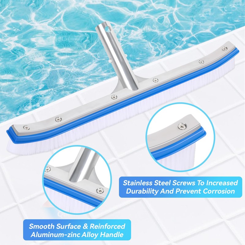 • Durable Pool Brush: This 18-inch wide swimming pool cleaning brush features a plastic brush with firm bristles that can thoroughly clean indoor pools. Swimming pool brush is equipped with a high-quality stainless steel handle and reinforced brush head design, ensuring strong performance even in harsh cleaning conditions.