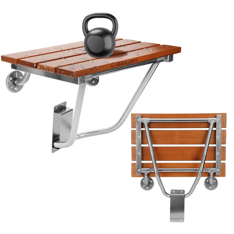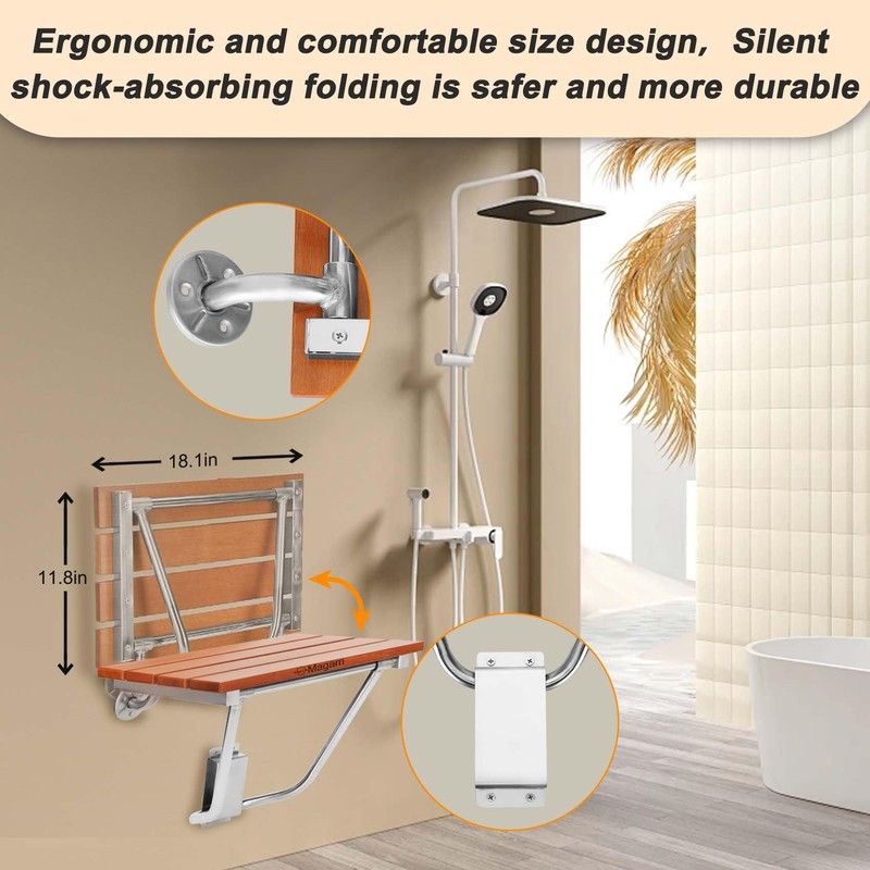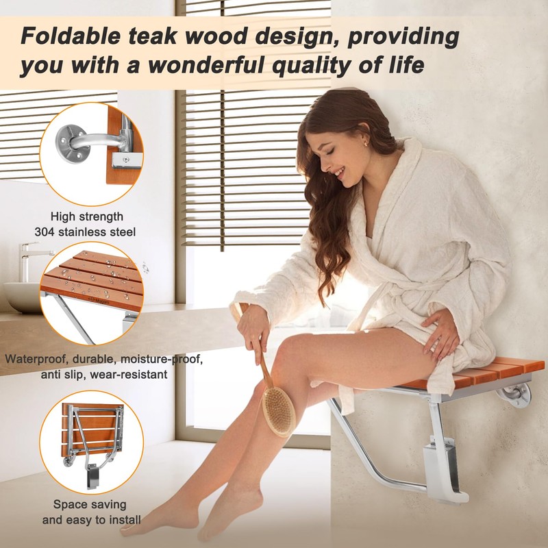 • Teak Wood material: The Folding Shower Seat Wall Mounted is composed of one-piece high-strength usu304 stainless steel and waterproof and durable teak. Holds up to 400 lbs. The circlip is designed to be folded and folded smoothly, and this structure is more secure and stable