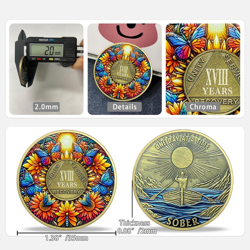 - Celebrate Milestones This 18 Year Sobriety Coin celebrates a major achievement in recovery, marking a year of sustained sobriety. It symbolizes a commitment to a healthier, addiction-free life and serves as a tangible reminder of the progress made and the ongoing dedication required to maintain this path.