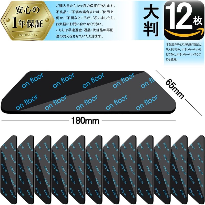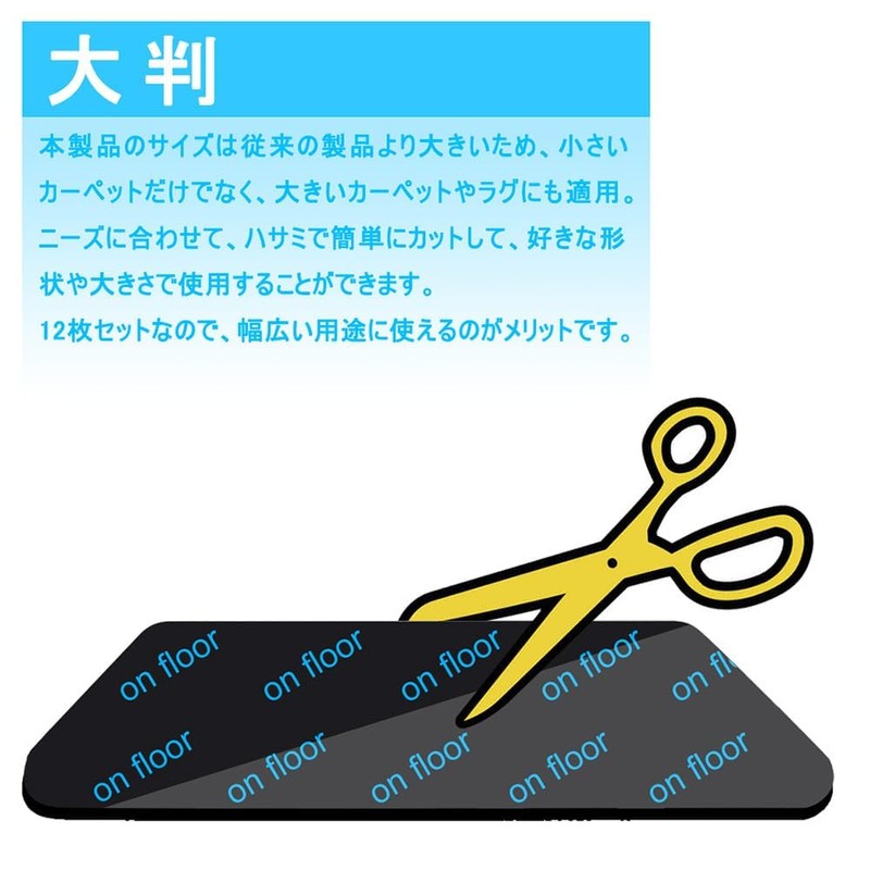 - 【大判・12枚セット】本製品のサイズは従来の製品より大きいため、小さいカーペットだけでなく、大きいカーペットやラグにも適用。ニーズに合わせて、ハサミで簡単にカットして、好きな形状や大きさで使用することができます。12枚セットなので、幅広い用途に使えるのがメリットです。