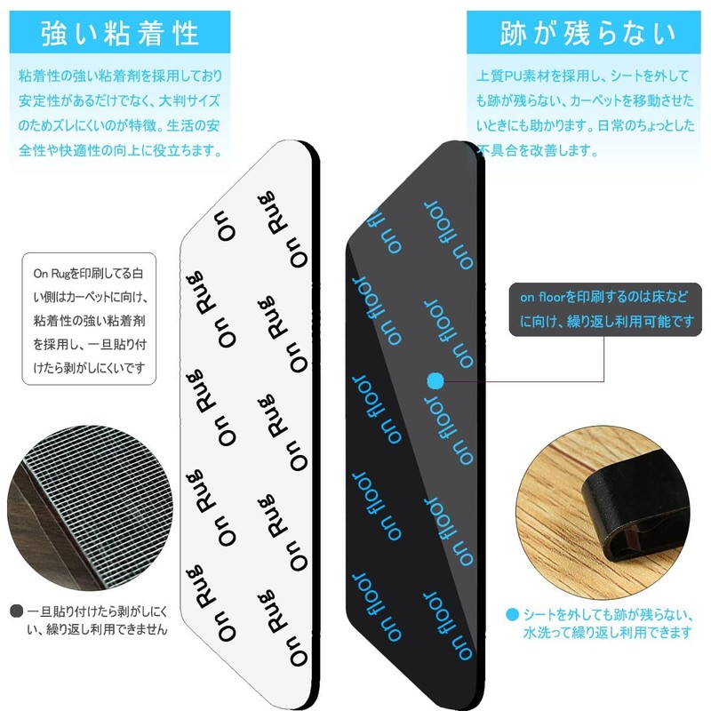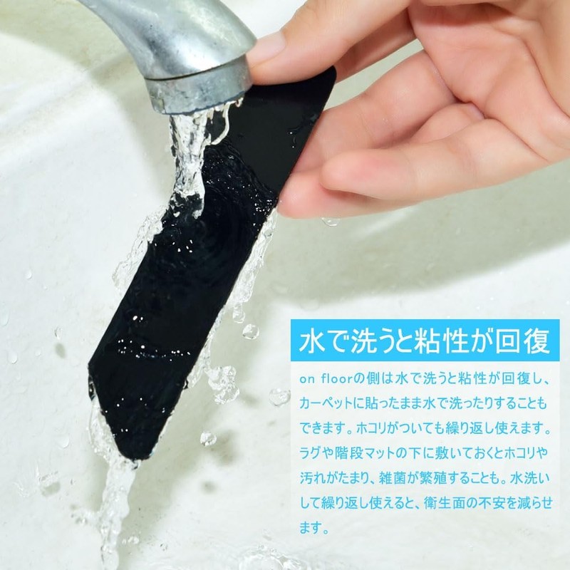 - 【繰り返し使える】on floorの側は水で洗うと粘性が回復し、カーペットに貼ったまま水で洗ったりすることもできます。ホコリがついても繰り返し使えます。ラグや階段マットの下に敷いておくとホコリや汚れがたまり、雑菌が繁殖することも。水洗いして繰り返し使えると、衛生面の不安を減らせます。