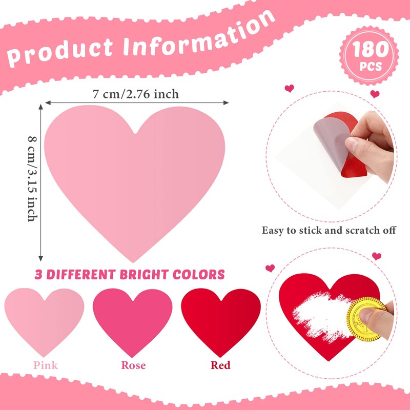 - Ample Quantities to Use and Share: there are 180 pieces of scratch off heart stickers in the package, which are available in 3 colors, 60 pieces for each color; The abundant quantity and diverse colors can satisfy your various use and replacement needs on Valentine's Day and in your daily life
