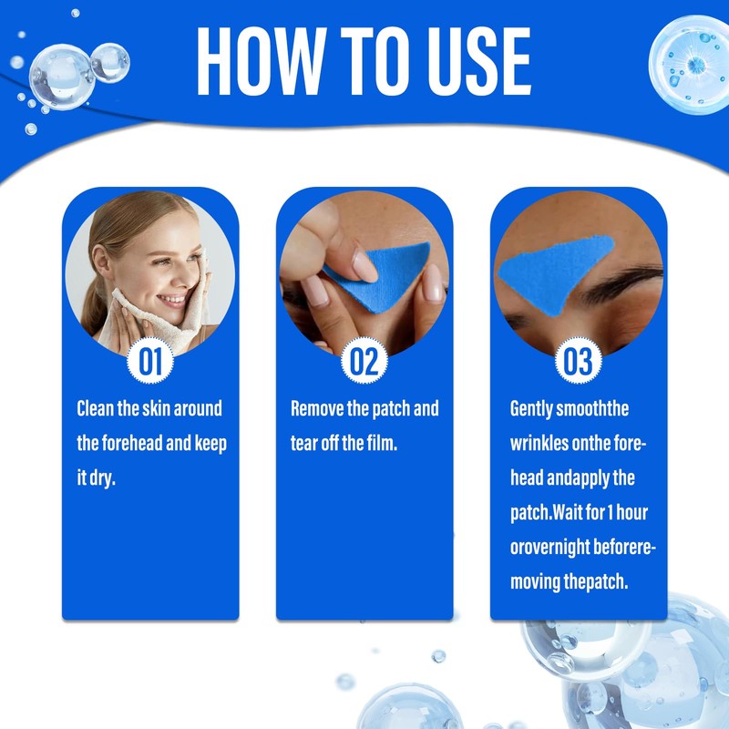 - Schnell und Einfach: Reinigen und trocknen sie zunächst ihre stirn. Anschließend den anti falten pflaster-akku entnehmen und die folie abziehen. Anschließend die fältchen glätten und pflaster gegen falten auftragen. Warten sie 1 stunde oder über nacht, bevor sie es entfernen. Der gesamte vorgang ist einfach und schnell, ohne komplizierte schritte, was dem hektischen tempo des modernen lebens entspricht.