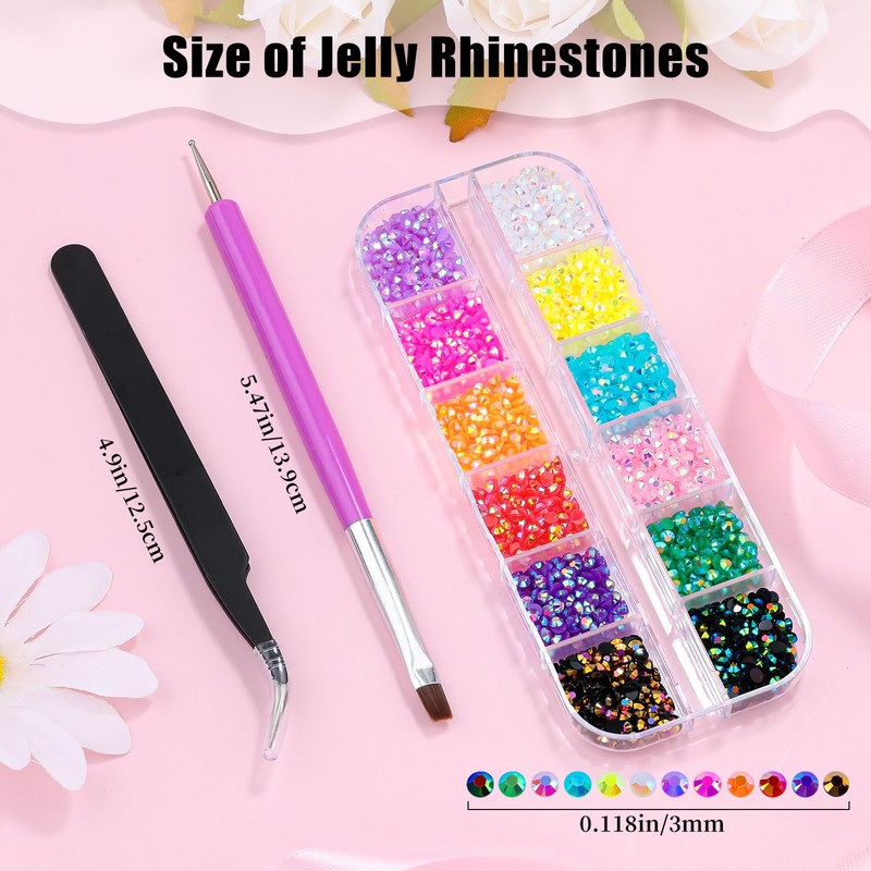 1800pcs 3mm Jelly AB Flatback Nail Art Rhinestones, Resin 3D Sparkling Nails Crystal Diamonds Gems Mini Charms with Tweezers and Dual-end Brush for Crafts Artwork DIY, Face Makeup Gems Jewels (9-K1)