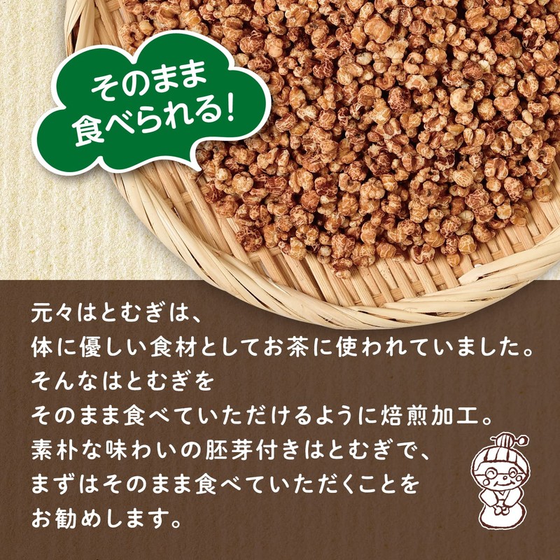 - 【お召し上がり方】お煎茶等にスプーン1杯を入れて、はとむぎ茶として/フライパンを使って砂糖、食塩等を塗して美味しいおやつ に!/牛乳、ヨーグルト、はちみつをかけたり、このままで/おにぎりにも!