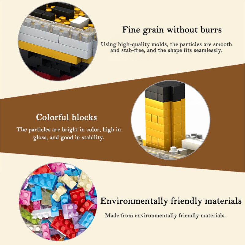 1、High Playability: Package List 1860 pieces micro bricks, include detailed step-by-step color instructions, Great details with assorted sizes and color pieces. This micro block set is a superior building experience with greater challenge, sophistication and detail than any other construction set. 2、 Safe and Durable: Made of original ABS material,durable plastic kits. With bricks as small as 4mmx5mm, the smaller the brick the better the build. 3、 Interactive Game Toy: Can training kid's coordination of the body through practicing of assembling the bricks . Improving patience, and cognitive skills.Because of the huge project, it is suitable for families to assemble together,while can promote the communication among family members. 4、 Best Gift: Wonderful recreation activity, Perfect gift for both adults and ages 8 years up children.Collect, Build and Display World Famous Craft in your home,Wonderful 3D art.