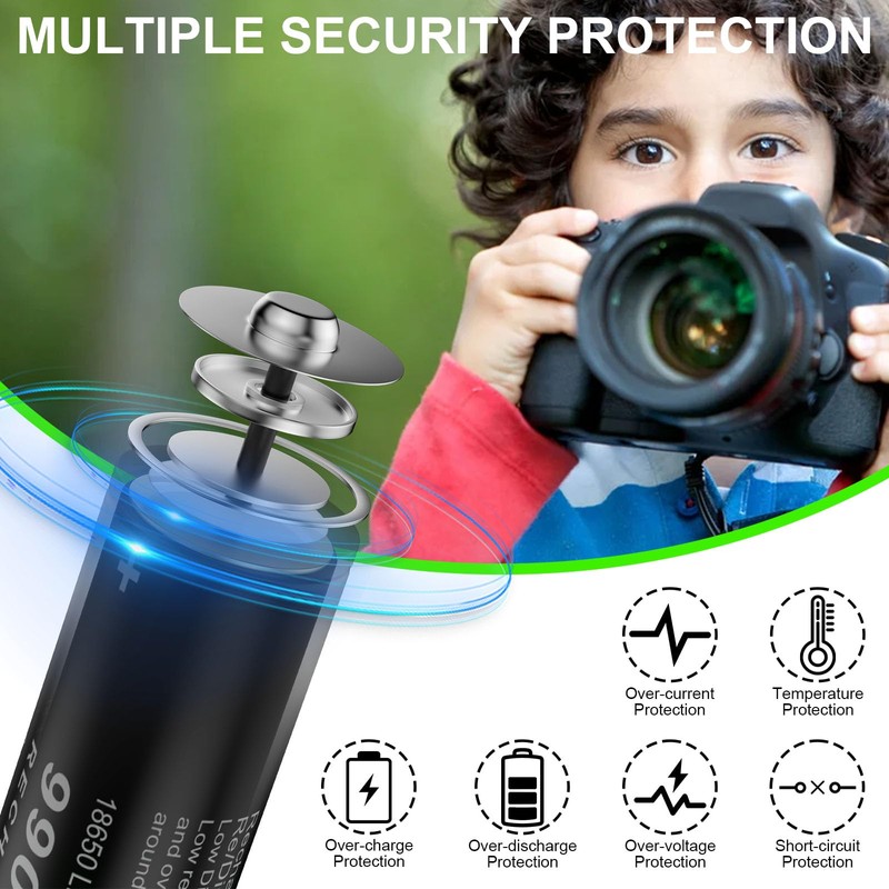 - 【Safety Protection】18650 battery has built-in multiple protection functions, such as under-voltage protection, over-voltage protection, over-current protection, over-temperature protection, short-circuit protection, and anti-reverse connection protection to stabilize the battery, so you can use it without any worries