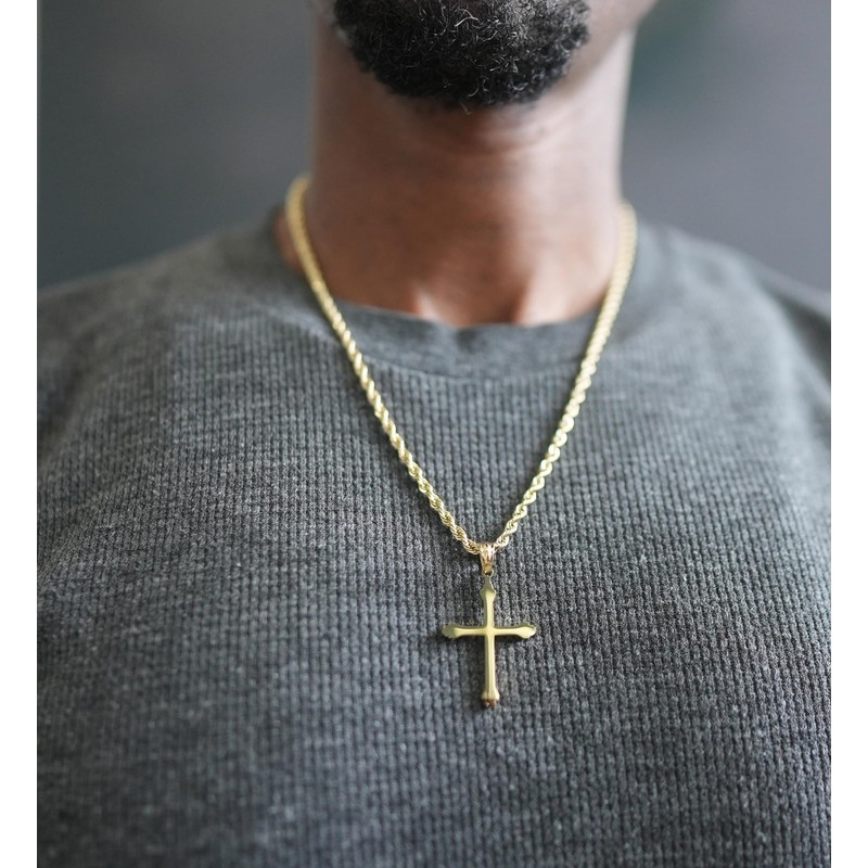 - Sturdy: High-grade Quality Gold cross Necklace Pendant with Versatile Rope Chain for men, Women. It is a long lasting and sturdy Cross necklace for daily wear without worry. The gold cross pendant Size is 35mm high and 24mm wide. The included Gold FIlled Rope Chain is 3mm wide.