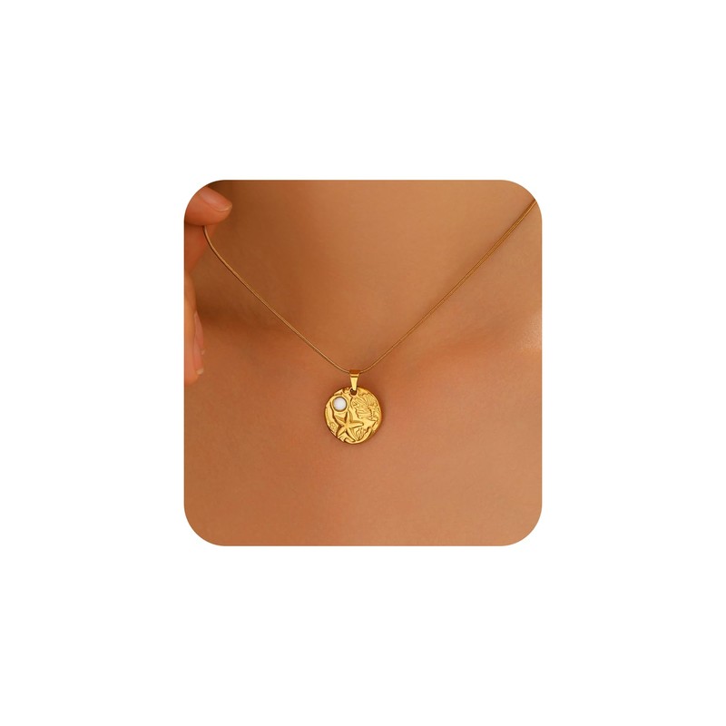 18K Gold Plated Charm Necklace for Women Trendy Coin Sun Shell Starfish Seashell Sea Turtle Seahorse Ocean Series Pearl Pendant Necklaces Boho Summer Beach Jewelry