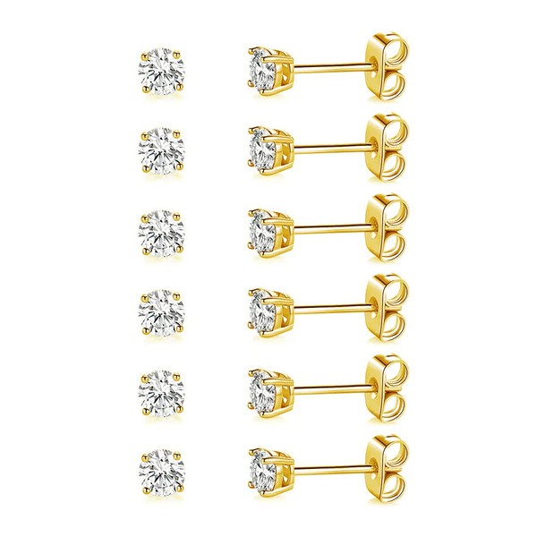 18K Yellow Gold Plated 3.0 mm Round Clear Cubic Zirconia Stud Earring Pack of 6 Pairs
