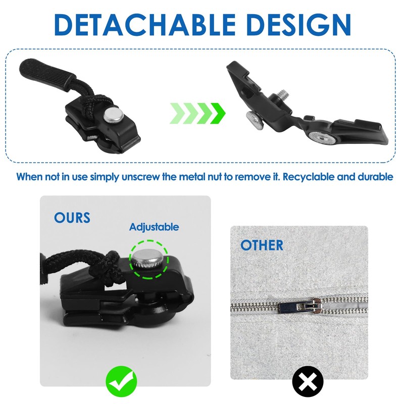 • Versatile Applications: The 3 sizes of our zips sliders cater to a wide range of items; Instant zip fixer suitable for zipper sliders on clothes, jackets pants backpacks suitcases tents wallets and more; Removable zipper puller enjoy the flexibility to repair multiple items without needing to buy new ones