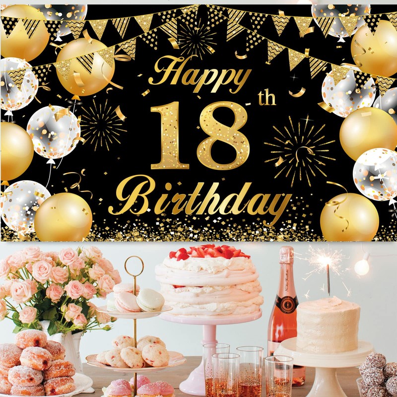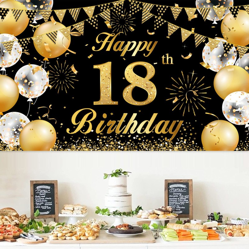 - Innovative design: banner 18th birthday. The design is mainly in black and gold. An oversized Happy 18 Birthday number, balloons, triangular banners, fireworks and confetti designs.