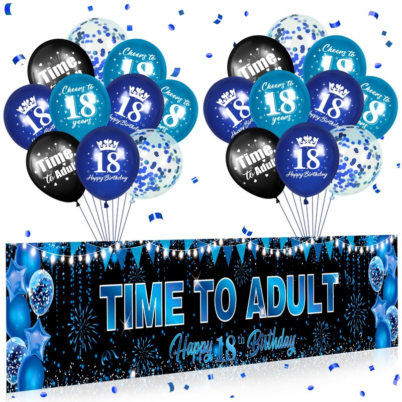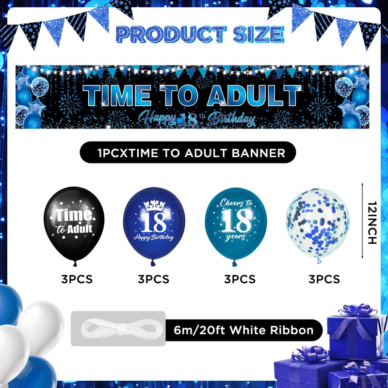 - 【Package List】The blue black 18th birthday party decorations set includes a "Time To Adult, Happy 18th Birthday" banner and 20pcs latex 18th birthday party balloons. If you choose our blue black happy 18th birthday party decorations, it will make your 18th birthday party more memorable.