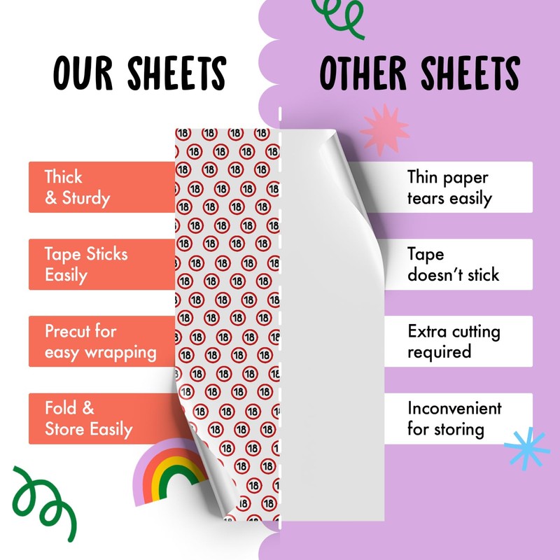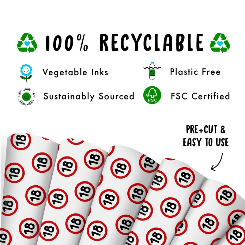 18th Birthday Wrapping Paper - 6 Sheets of Wrapping Paper - Funny Wrapping Paper Sheets for 18 Years - Stop Sign - for Men and Women - Teens - With Funny Stickers - By Central