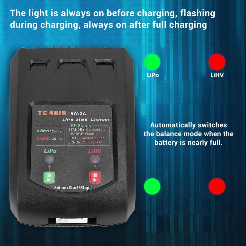2. Intelligent Balance Mode: Designed for LiHV batteries, this charger automatically switches to balance mode when nearing full charging, indicated by steady, flashing, and steady lights for charging status updates.