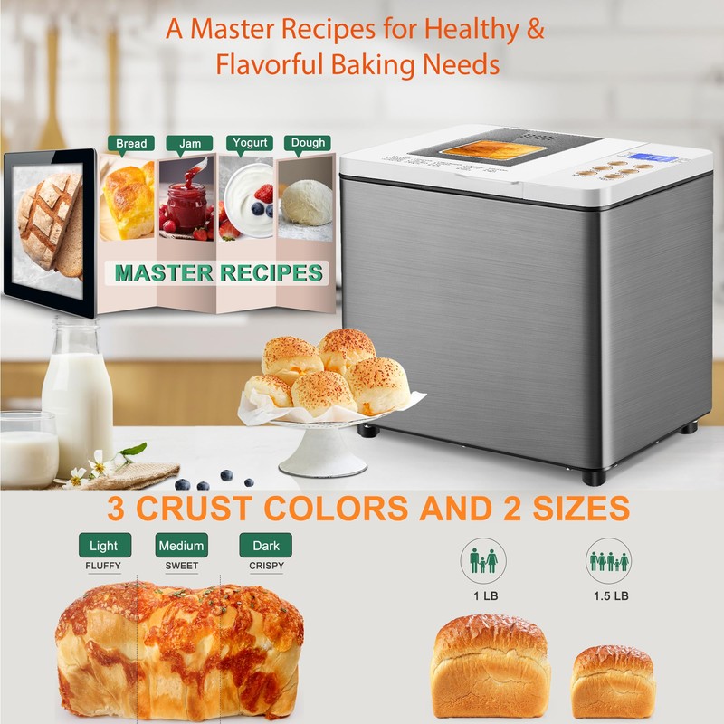 - EASY TO USE & COMPACT BREAD MACHINE: Automatic mixing, kneading, rising, can be used pizza and pasta dough, only 3 steps: add ingredients, select menu and loaf size (1.5 lb / 1 lb), press start button, with a large digital intuitive display and window for you to see the process at a glance. The stainless steel bread machine is long-lasting durability, rust-proof, elegant silver exterior. The advanced compact design allows this portable bread maker to fit perfectly into kitchen cabinets for easy storage.