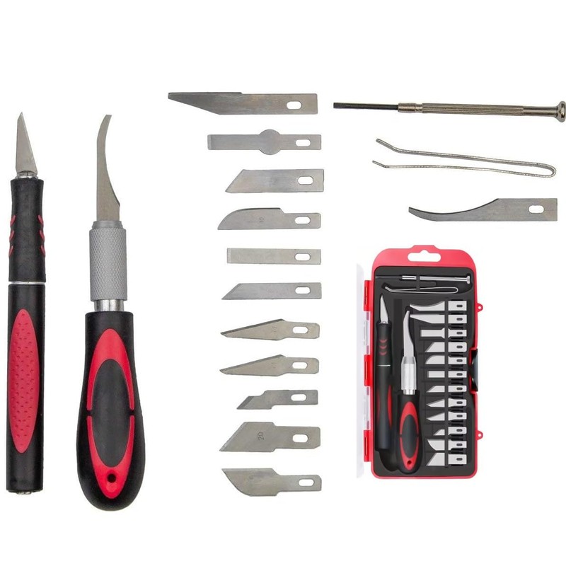 - 19pcs precision knife set, including: 14pcs blade Knife blades, 2 craft knife handle(ABS TPR), 1-precision screwdriver, 1-tweezers, 1-Storage case.