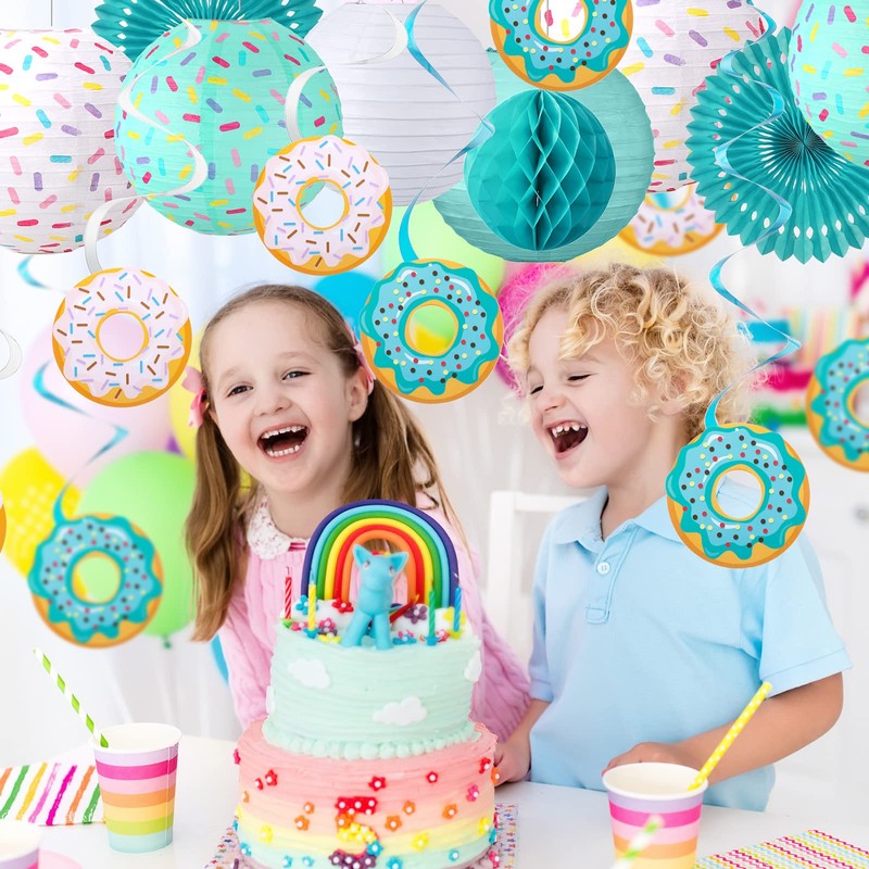 - Appropriate Size for Decorating: the 2 big sprinkle party lanterns and paper fans are approx. 30 cm/ 11.81 inches in diameter, while the solid colored lanterns are approx. 25 cm/ 9.84 inches; The honeycomb ball is approx. 20 cm/ 7.87 inches in diameter, and the donut swirls have a diameter of approx. 15 cm/ 5.91 inches, and a length of approx. 70 cm/ 27.56 inches, which can well bring out the charm in each other