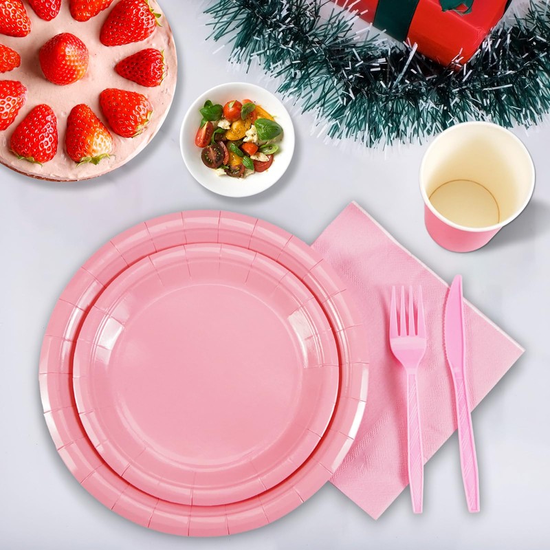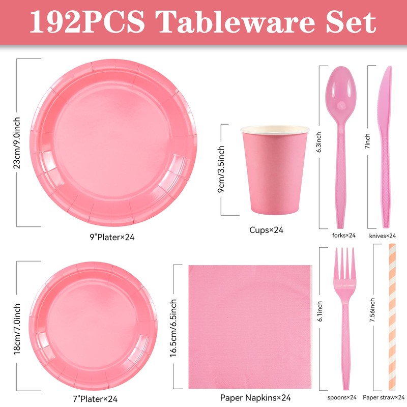 - 192 piece Soild party tableware set, safe and practical decoration. Perfect for 24 guests. You will receive a Set of solid color disposable tableware . Package contains: 24 9“ paper plates, 24 7” paper plates, 24 9 oz paper cups, 24 6.5” paper napkins,24 Spoons,24 knives,24 forks,24 Paper straws.
