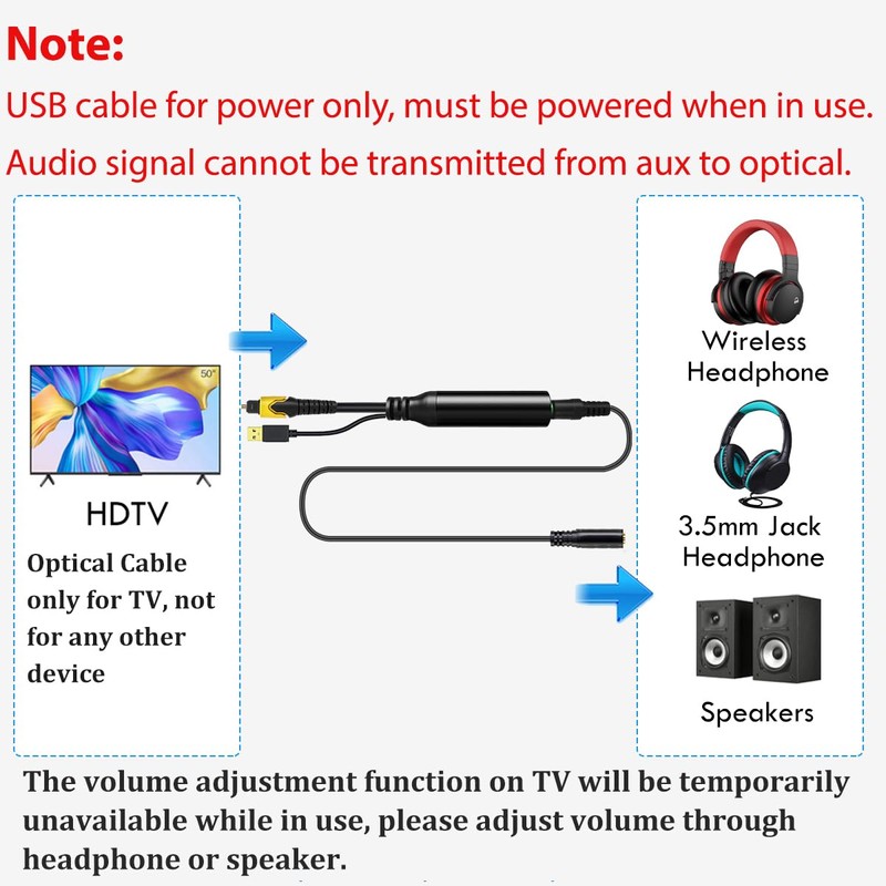- Attention - Optical cable plugged into TV's optical port, only for TV output audio signal, not for any other devices. 3.5mm Jack for headphone or speakers recving audio signal, bring new life to your analog stereo sound system.