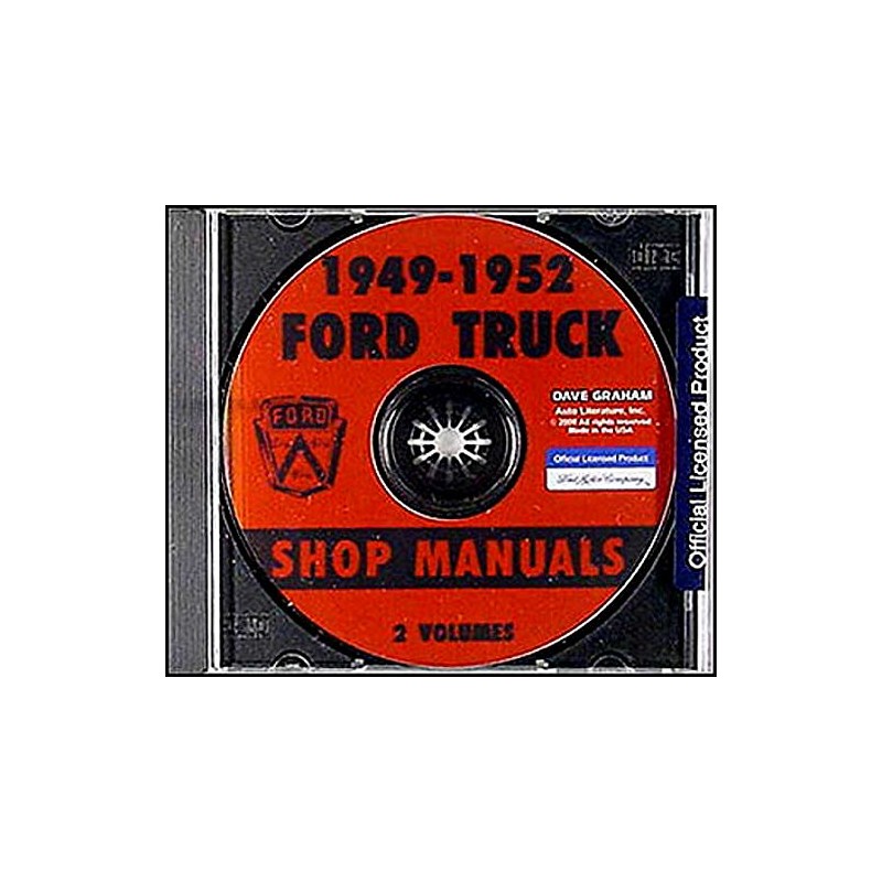 This CD-ROM offers the complete "1949-1950-1951 Ford Truck Shop Manual" and the "1952 Ford F-Series Trucks Shop manual Supplement." These .pdf files are page-for-page reproductions of the bound manuals that Ford mechanics used to service trucks. You will find detailed service procedures for inspecting, repairing, and replacing the parts, assemblies, and systems on the truck. The CD covers the H-series 6-cylinder, M-series 6-cylinder, R-series 8-cylinder, and E-series 8-cylinder engines; as well as ignition, fuel, cooling, clutch, transmission, gearshift linkage, overdrive, power steering, running gear, brakes, rear axles, drivelines, tandem rear axles, electrical, accessories, bodies & cabs, and much, much more. The "1952 Ford F-Series Trucks Shop manual Supplement" contains service information on the features that were new on the 1952 Ford trucks. The supplements will refer you back to the 1949-1951 manual on this CD for any procedures that did not change. With the step-by-step instructions, schematics, specifications, special tool lists and wiring diagrams in these manuals, you will have the information you need to keep your project on the road. The 1949-51 shop manual has 385 pages, and the 1952 supplement has 97 pages. You can use the information on this CD to restore all V-8 and six-cylinder, 1949-1952 Ford pickup, panel, F-1, F-2, F-3, F-5, F-6, F-7, & F-8, conventional, cab-over-engine (COE), medium duty, and heavy duty trucks.