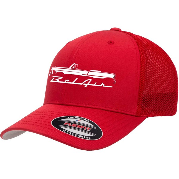 1955 Belair Convertible Outline Design Flexfit Trucker Mesh Fitted Cap red